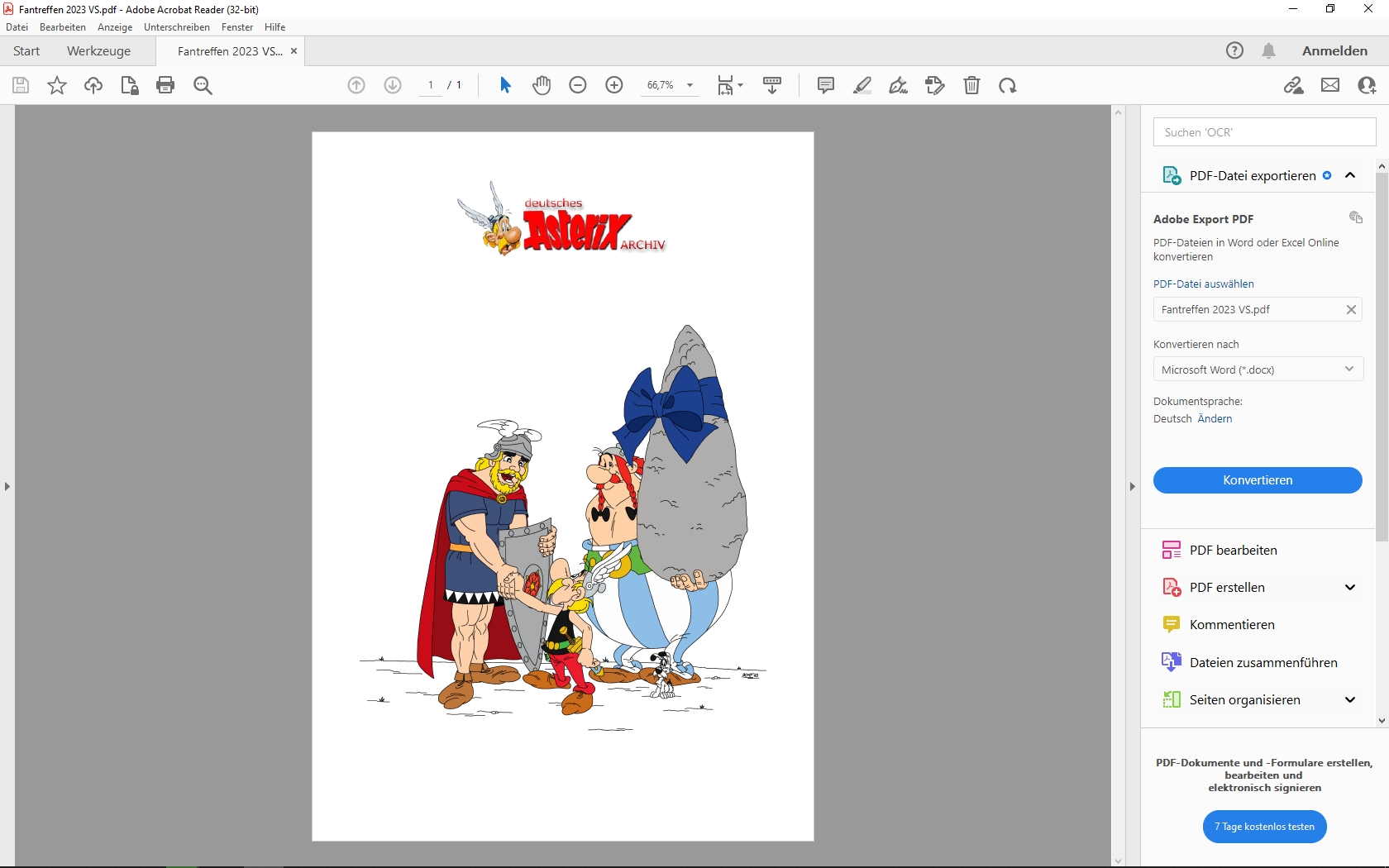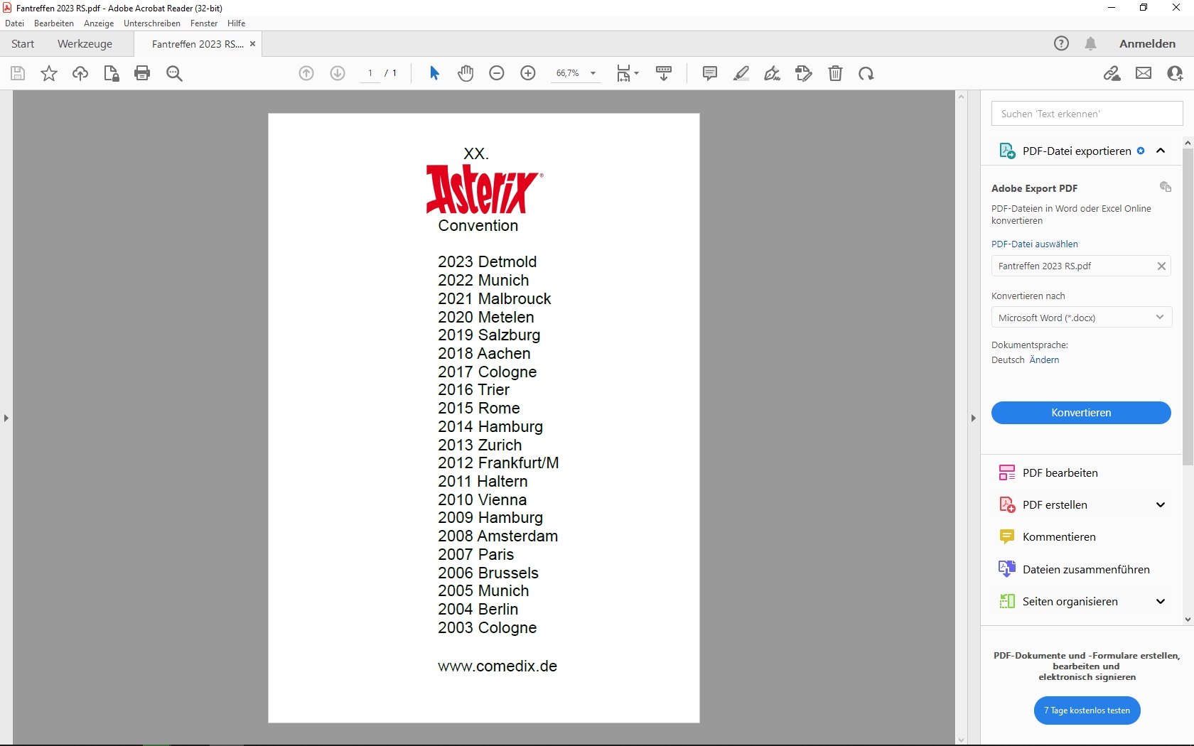 beim letzten Mal hatten wir auf der Vorderseite das Logo vom Asterix Archiv mit abgedruckt, soll das wieder drauf? Und für die Auflistung auf der Rückseite, das ist jetzt das 20. (XX.) offizielle Treffen, oder? Nach Metelen 2020 hat 2021 ja kein wirkliches Treffen stattgefunden, 2022 war München (Munich) und 2023 Detmold (da wüsste ich keine englische Bezeichnung)