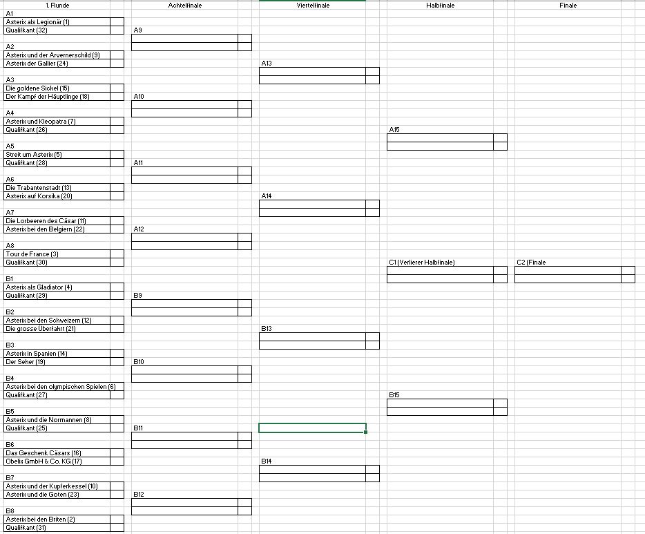 Logisch und mathematisch bekomm ich das nicht auf die Kette:Comedix hat geschrieben: 3. Januar 2024 12:16 mein Asterix-Turnierplan sieht nun so aus. 16 Abenteuer aus der Goscinny/Uderzo-Zeit sind gesetzt. Die in Klammern angezeigte Rangfolge in der Setzliste ergibt sich aus der Rangliste der Asterix-Hefte in meiner Bibliothek. Vor dem Turnier werden unter den 16 nachfolgenen Alben in einer Qualifikation 8 Ausgaben ermittelt, die im Turnier die Liste der 32 Teilnehmer vervollständigt. Die Setzliste dieser 8 Ausgaben ergibt sich ebenfalls aus der Rangliste. Gibt es aus eurer Sicht einen handwerklichen oder logischen Fehler, den ich nicht erkenne?