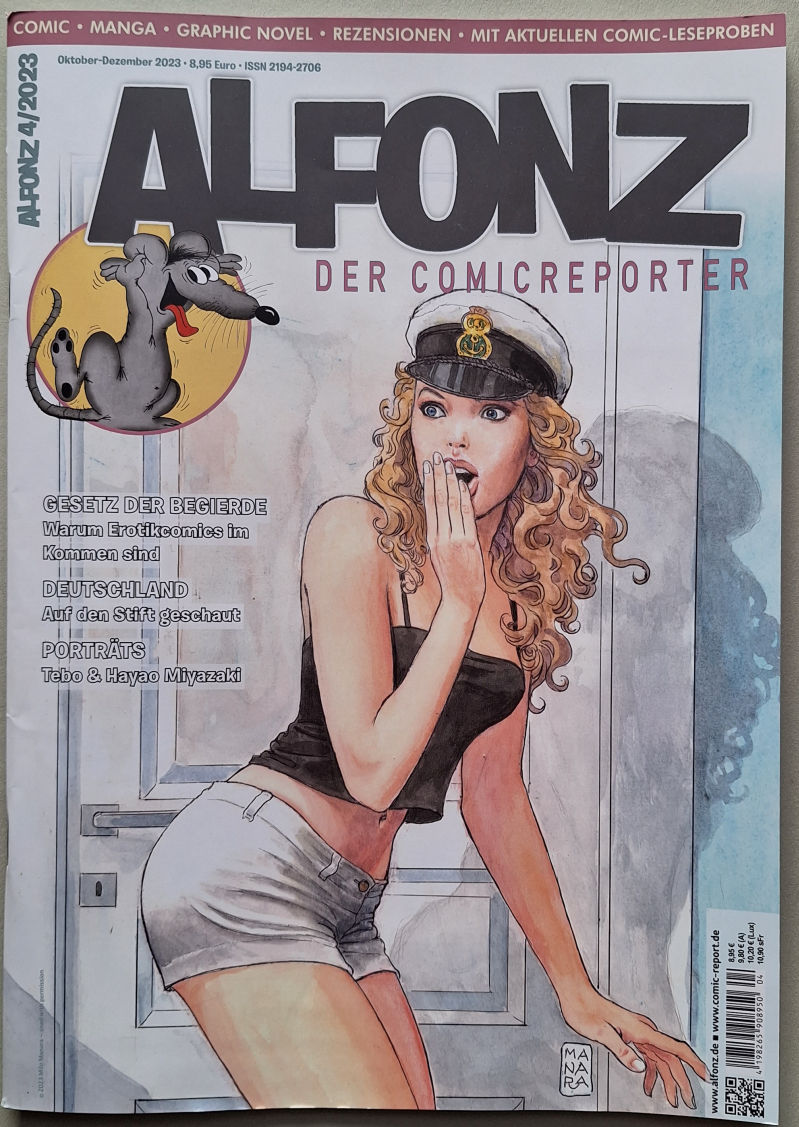 der bestehende Bibliothekseintrag "Alfonz" sollte um die aktuelle Ausgabe 4/2023 - Oktober-Dezember 2023 - ergänzt werden. Darin befindet sich ein ganzseitiges Interview mit dem Egmont-Verlagsleiter Wolf-Stegmeier, geführt von Alex Jakubowski, zu dem Band "Asterix - Die weiße Iris". Das Interview stammt allerdings von vor dem Erscheinen des Bandes, so dass Wolf Stegmeier darin auf den konkreten Inhalt noch kaum eingehen darf. Er bewertet den neuen Band - angesichts seiner Stellung als Verlagsleiter wenig überraschend - mit "V von V stellae".
