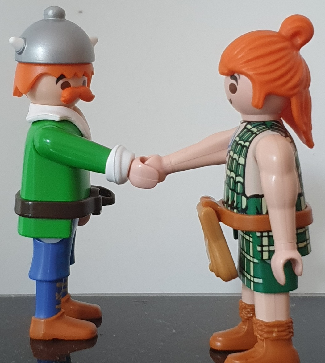 "Ihr seid gewisslich Kaledonier, ich vermute? Lasst uns schütteln die Hände!"