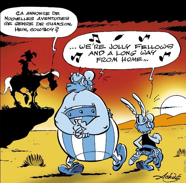 "Die Daltons in der Schlinge" = "La corde au cou". Mitten in der Geschichte (Jolly Jumper fragt: "Schon?")! Da wird also nicht nur Asterix aufs Korn genommen, sondern auch Lucky Luke selbst. Denn natürlich endet das Album nicht damit, dass Lucky Luke in den Monduntergang reitet, das muss 26 Seiten später natürlich der Sonnenuntergang sein und dann singt der einsame Cowboy auch den richtigen Text.
