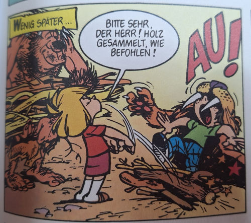 Hier wirft Luzie Max - der sich gerade zum Anführer aufgeschwungen und sie wie eine Untergebene behandelt hat - einen Stapel Brennholz auf die Füße. Sowohl ihre unbeugsame, Stolz ausdrückende Körperhaltung, als auch seine Reaktion "AU!" erinnern mich deutlich an "Asterix der Gallier", Seite 5. Bild 2.