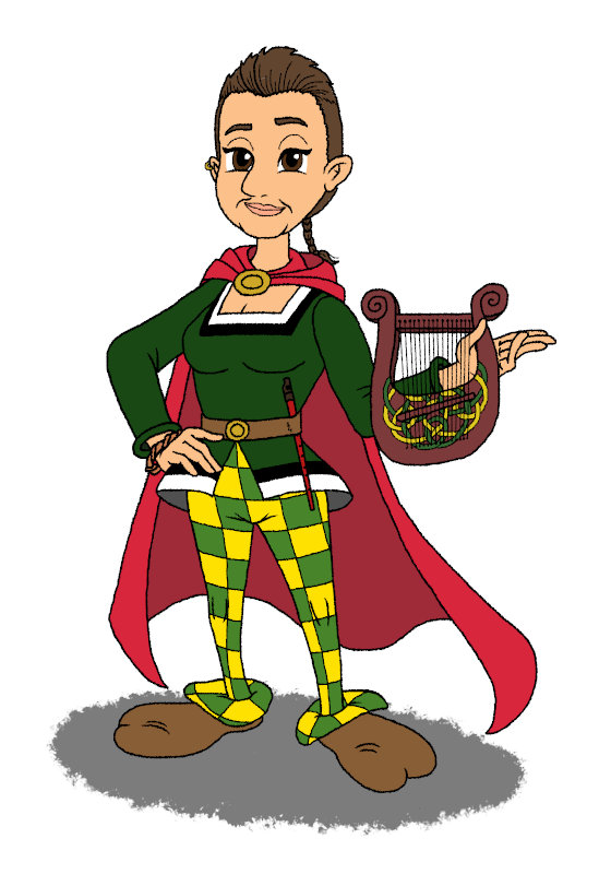 Du kombinierst also ganz ungeniert gallische Hosen mit römischer Tunika, was dich als romanisierte Gallierin identifiziert! Auch die dominierende Farbe (grün, also nicht blau, weiß oder rot) weist dich als solche aus. Das rote Cape ist Häuptlingen, Druiden und - hier - Barden vorbehalten. Lyra und Flöte sind superschön geworden, und auch der Wandelring am Arm und der Ohrring sind sehr feine Details.