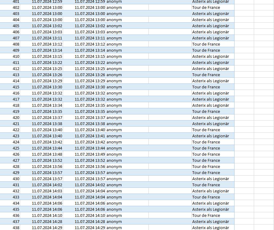 Als ich mir heute Morgen das Ergebnis des ersten Halbfinales ansah, freute ich mich zuerst. Mehr als 900 Stimmen. Wow! Davon 650 für den Legionär und der Rest für Tour de France. Aber irgendetwas stimmte nicht, denn in den letzten 60 Minuten zwischen 7 und 8 Uhr heute morgen wurden alleine etwa 340 Stimmen nur für den Legionär abgegeben. So sah das aus: