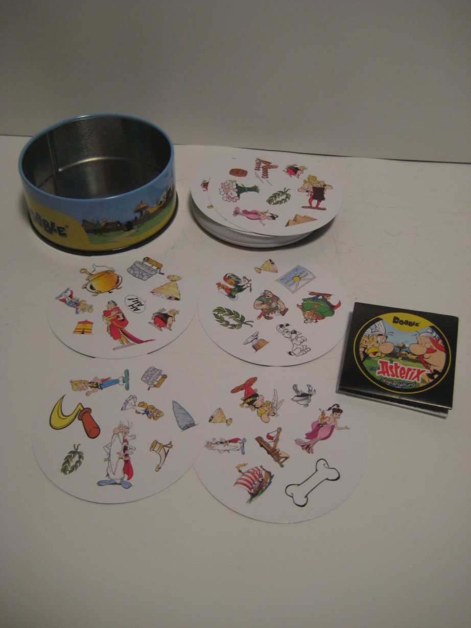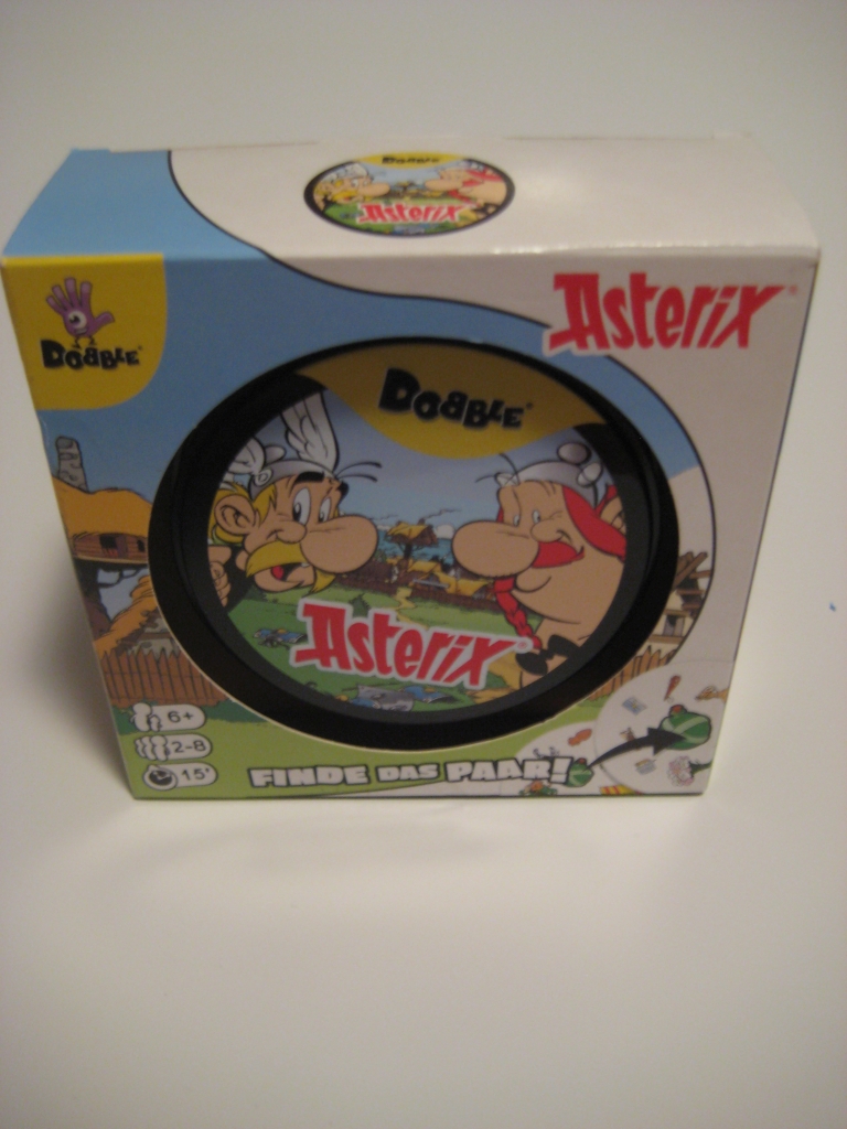 es gibt seit einiger Zeit das Spiel Dobble Asterix - Finde das Paar!, der Preis liegt bei ca. 16,99 €, Das Spiel enthält 55 Karten in einer Blechdose und es geht darum, bei zwei gezogenen Karten am schnellsten herauszufinden, welches Symbol auf beiden Karten abgebildet ist. Dazu gibt es noch weitere Spielvarianten.