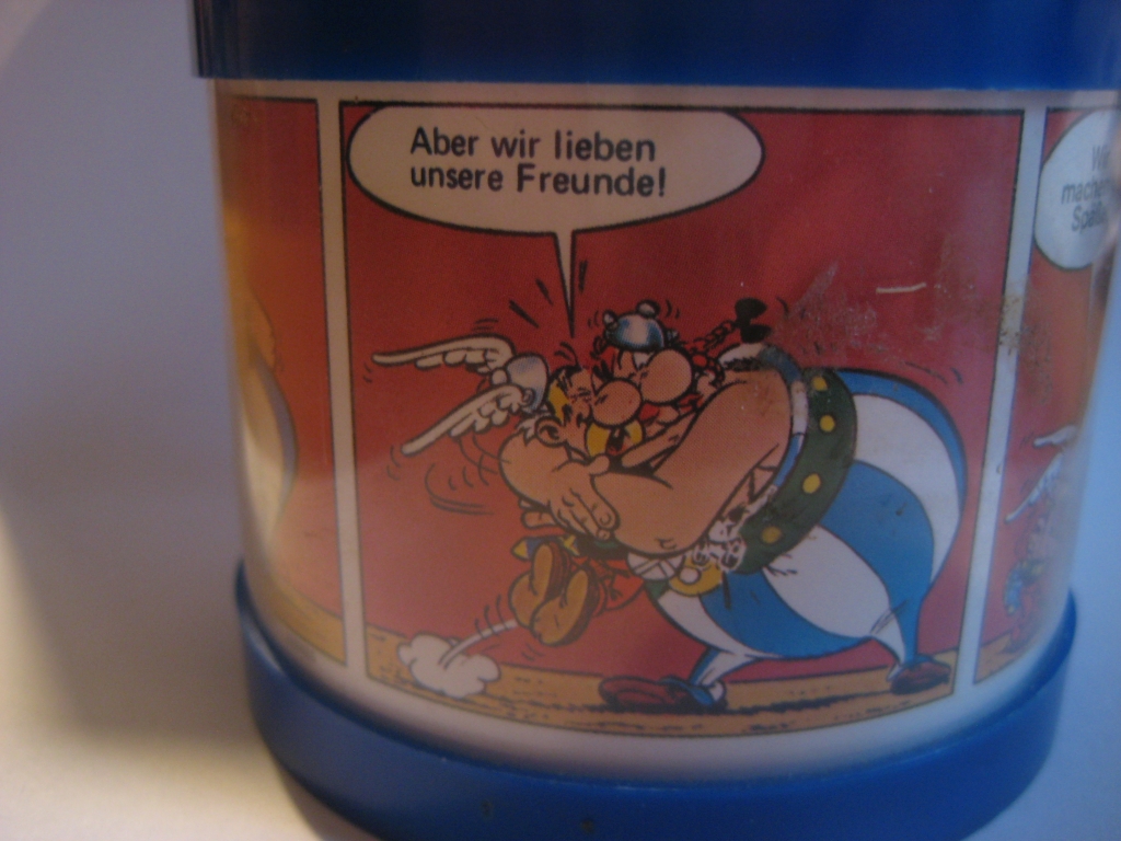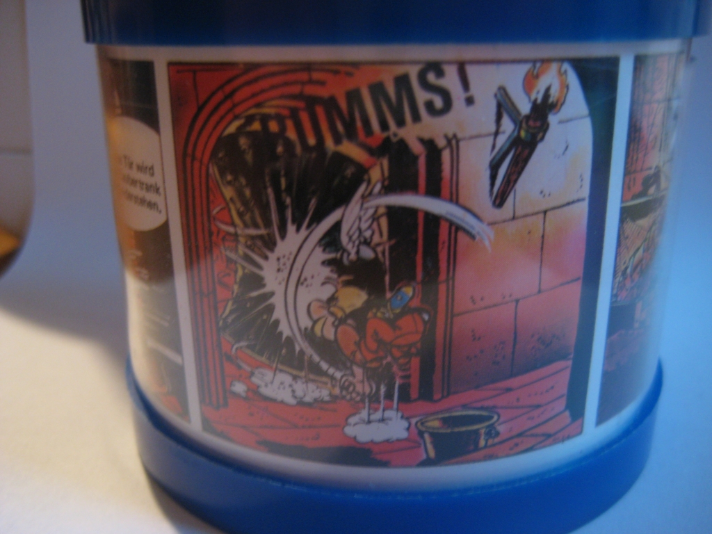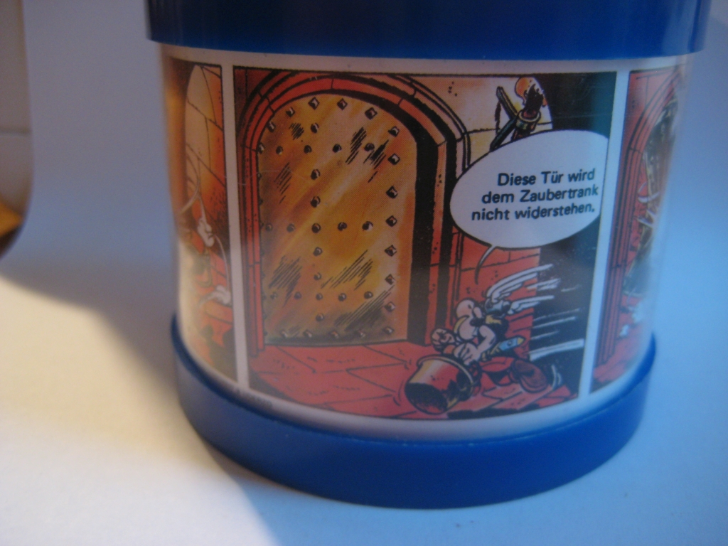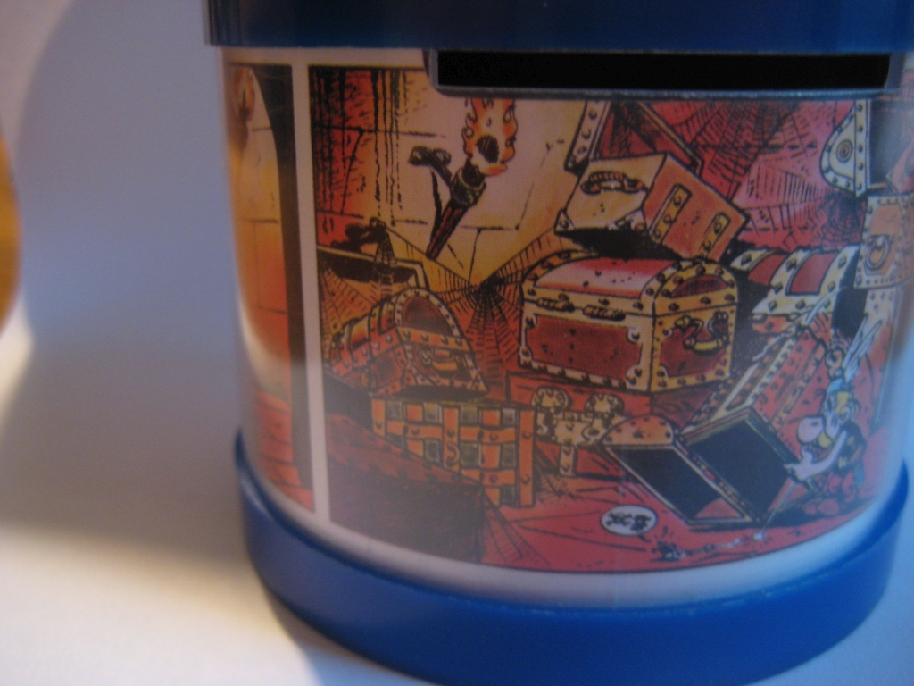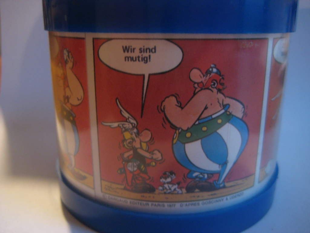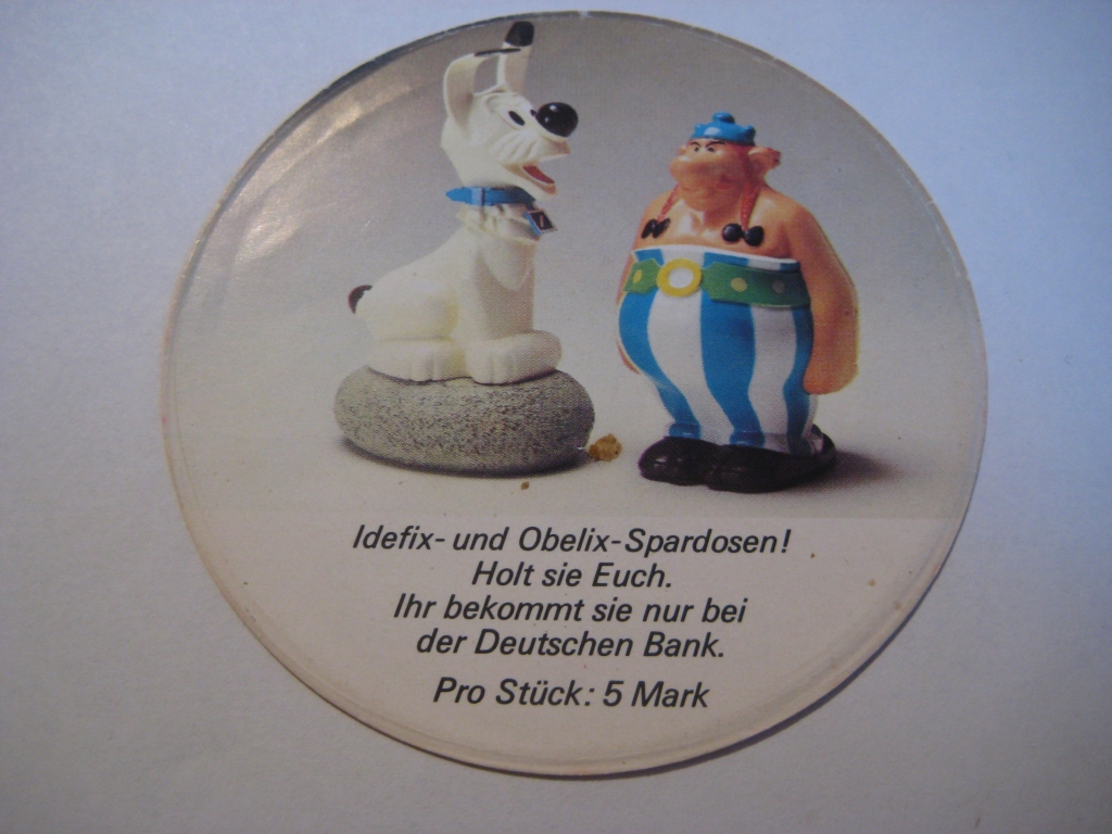 nochmal zu den Spardosen von der Deutschen Bank ab 1974, neben der abgebildeten Spardose mit dem Idefix auf dem Deckel und Motiven aus Überfahrt gibt es eine weitere mit Asterix auf dem Deckel und Motiven aus Kupferkessel. Auf der Rückseite der Deckel ist jeweils Werbung für die Idefix und Obelix-Spardosen, dort steht auch, dass man die Spardosen für je 5,- DM kaufen konnte,