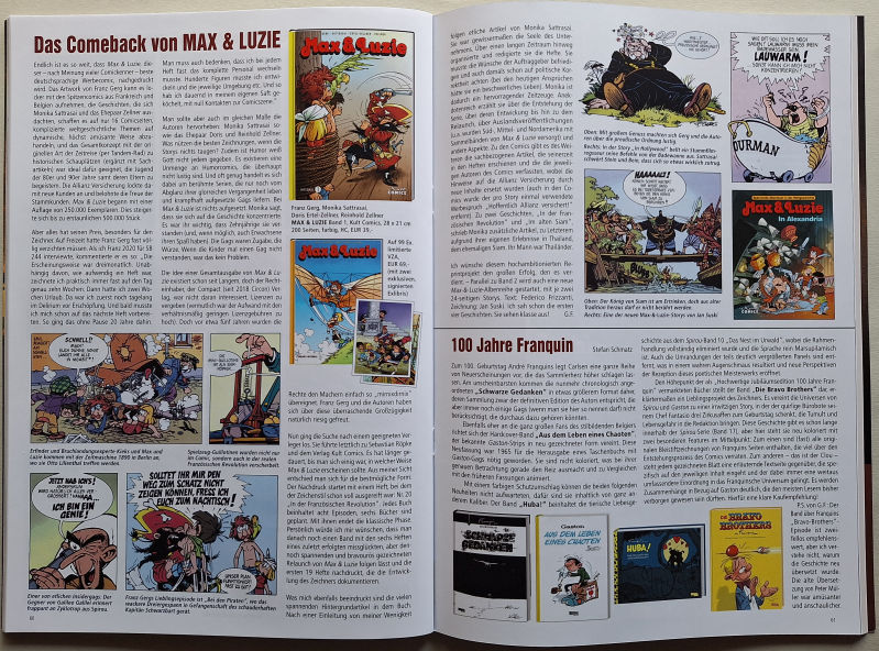 Im Innenteil des Magazins befindet sich eine eineinhalb-seitige Vorstellung der neuen Kult Comics-Ausgabe mit komprimierten Informationen zu ihrem Zustandekommen. So erfährt man darin, dass die Idee einer Gesamtausgabe von Max & Luzie schon lange existiere, aber bislang an der Rechtelage gescheitert sei. Vor circa fünf Jahren habe der Circon-Verlag (vormals Compact) den "Machern" (welchen genau steht da nicht) die Rechte einfach so übereignet. Dies ist anscheinend ganz oder weitgehend unentgeltlich geschehen, denn es heißt, Franz Gerg und die Autoren hätten sich "über diese überraschende Großzügigkeit" riesig gefreut.