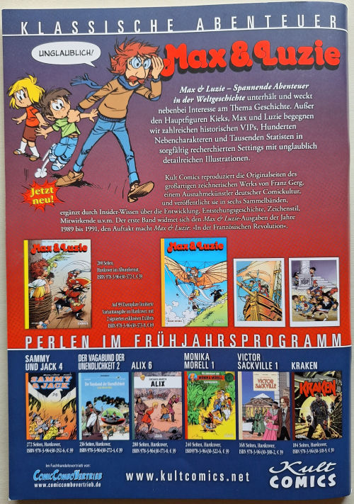 Am Schluss des Artikels findet sich dann noch die Information, dass parallel zu Band 2 die neue Max & Luzie-Albenreihe mit je zwei 24-seitigen Geschichten aus der Feder von Federico Frizzanti und Jan Suski gestartet werde. Wann dies der Fall sein soll, steht da allerdings nicht. Noch ist auf der Kult Comics-Internetseite dazu auch nichts angekündigt.