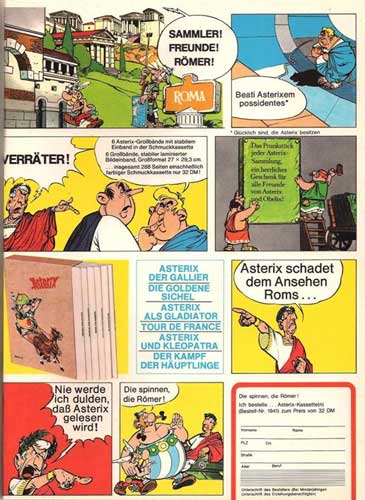 Besondere Fälle stellen zum einen eine weitere Werbeseite für die Asterix-Schmuckkassette in Band 13 ("Asterix und der Kupferkessel") dar. Sie lag dem Band nicht lose bei, sondern ist in der Erstauflage am Ende des Bandes fest eingebunden. Auch bei der Softcover-Ausgabe der Erstausgabe von "Asterix schwätzt schwäbisch - Dr grosse Graba" (Mundart Band 1) wird auf der Rückseite der letzten Seite Werbung für die dazu passende Hörspiel-CD abgedruckt.