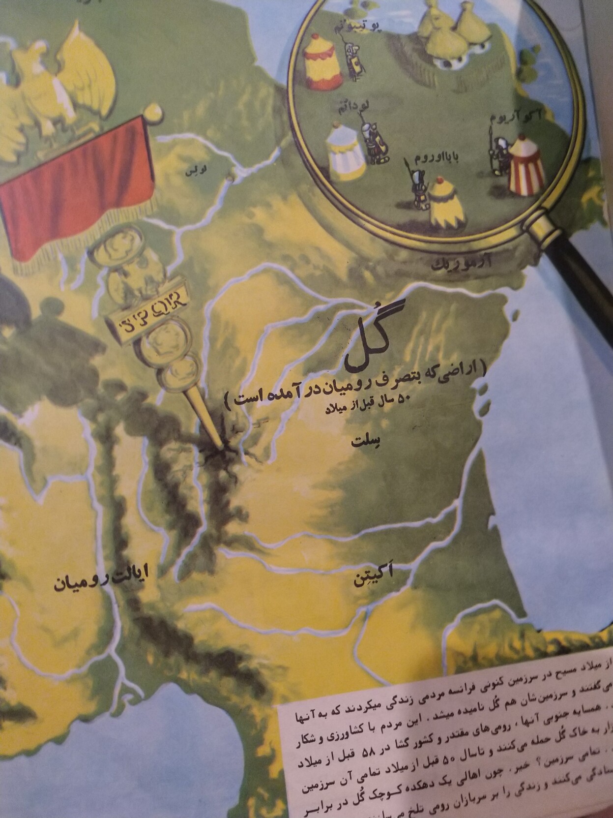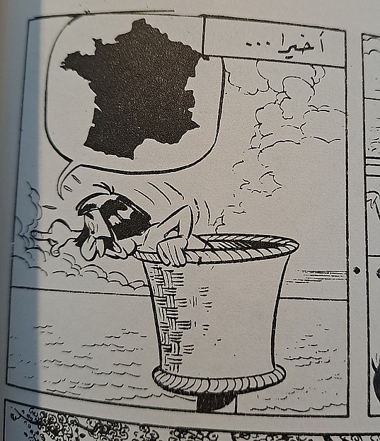Hier noch zweimal die Gallien-Hieroglyphe, richtigrum, aus einer ägyptischen und eben der genannten iranischen Ausgabe. Die Chance, es richtig hinzukriegen, liegt bei den Herausgebern von Asterix in Sprachen mit Rechts-nach-Links-Schriften über den Daumen gepeilt bei 50% :-)